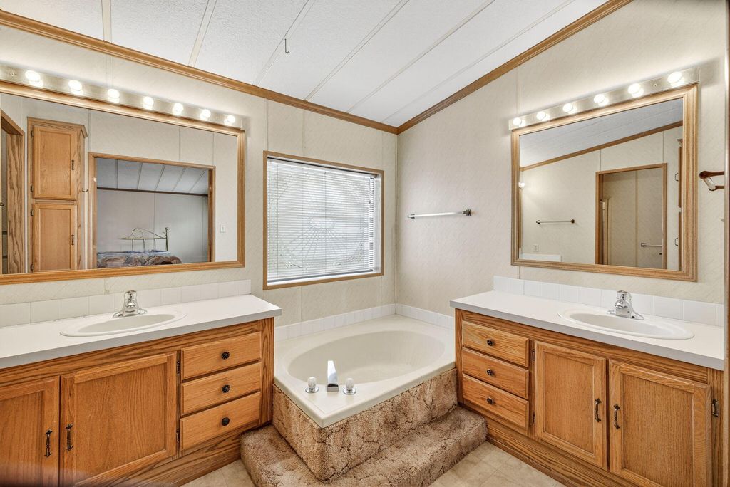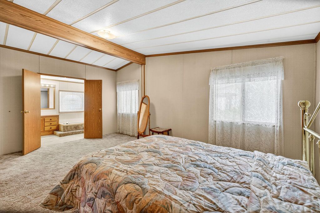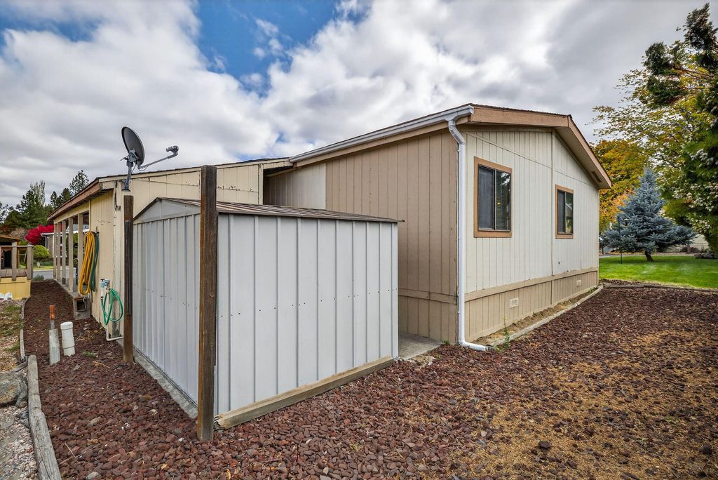 Welcome to easy living in Bend's desirable Suntree Village, a friendly and well-maintained 55+ community. This cozy and spacious home offers an open layout filled with natural light and plenty of potential to make it your own. While the home could use some updates, it has been well cared for overall and is priced accordingly to allow for improvements. Enjoy a private yard space, carport, and two storage sheds. Space rent includes water, sewer, garbage, sprinkler maintenance, and snow removal. Owner-occupied only, no sublease. All occupants must have park approval.